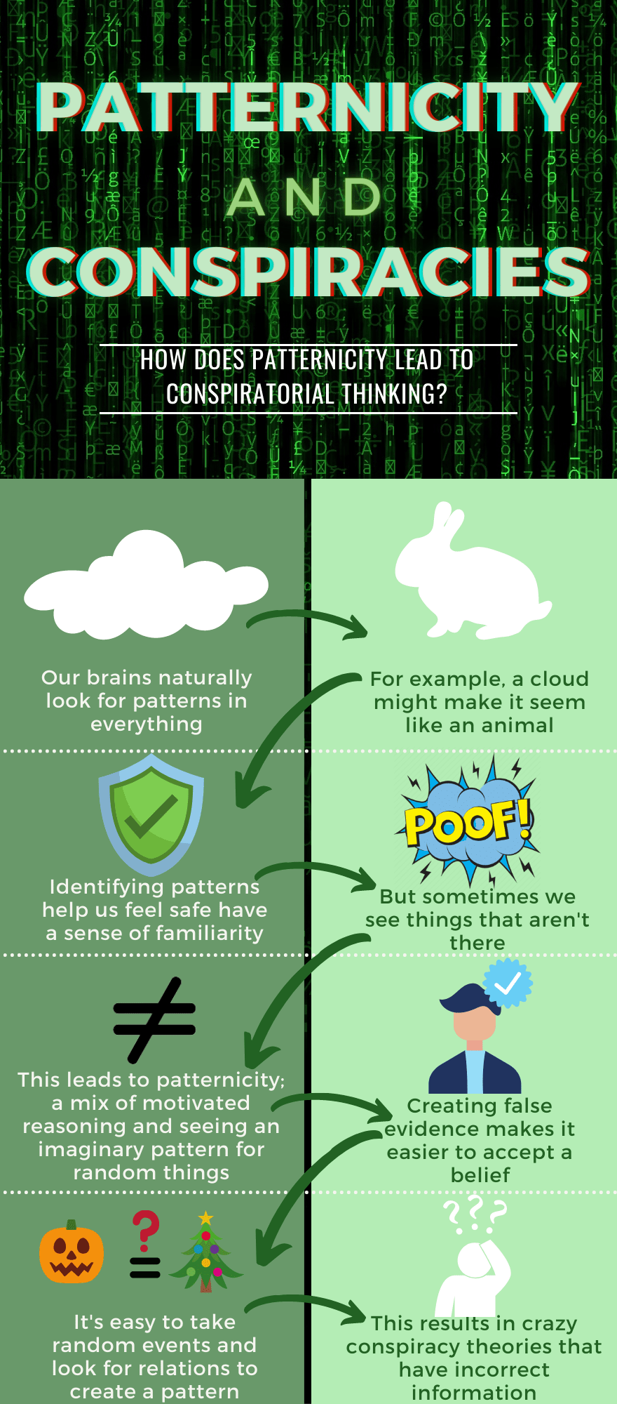 Patternicity is the term for this tendency to perceive meaningful patterns and connections among unrelated events. It’s often a harmless diversion. However, it can be used to support a belief that is otherwise lacking in evidence, like a conspiracy theory.