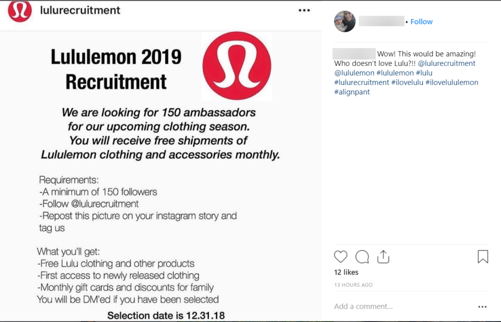 Several fake Lululemon accounts on Instagram posted an image advertising a fake brand ambassador program. This used a combination of engagement bait tactics, and it was widely shared by thousands of users. (In fact, Lululemon does have an ambassador program, but it is managed through individual stores — not online.) While the account that posted the original hoax no longer exists, the image it created continued to spread. (And the date can be manipulated, so this falsehood could continue into this year and beyond.)