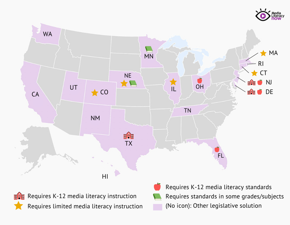 | States mandating some form of media literacy education prior to graduation: | Illinois, Texas, New Jersey, Delaware, Ohio, Florida, Colorado, Nevada, Connecticut, Minnesota and Massachusetts |